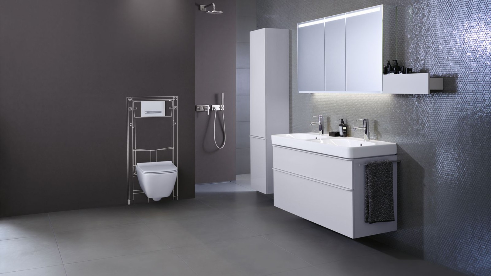 As soon as the sanitary technology hides behind the wall, a new feeling of space is created. A wall-hung water closet solution makes your bathroom look bigger.